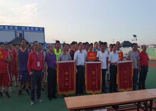 建設單位指揮部史副指揮長、工程部趙部長、監(jiān)理中企建發(fā)公司隋總為獲得冠軍、亞軍、季軍的籃球隊頒獎