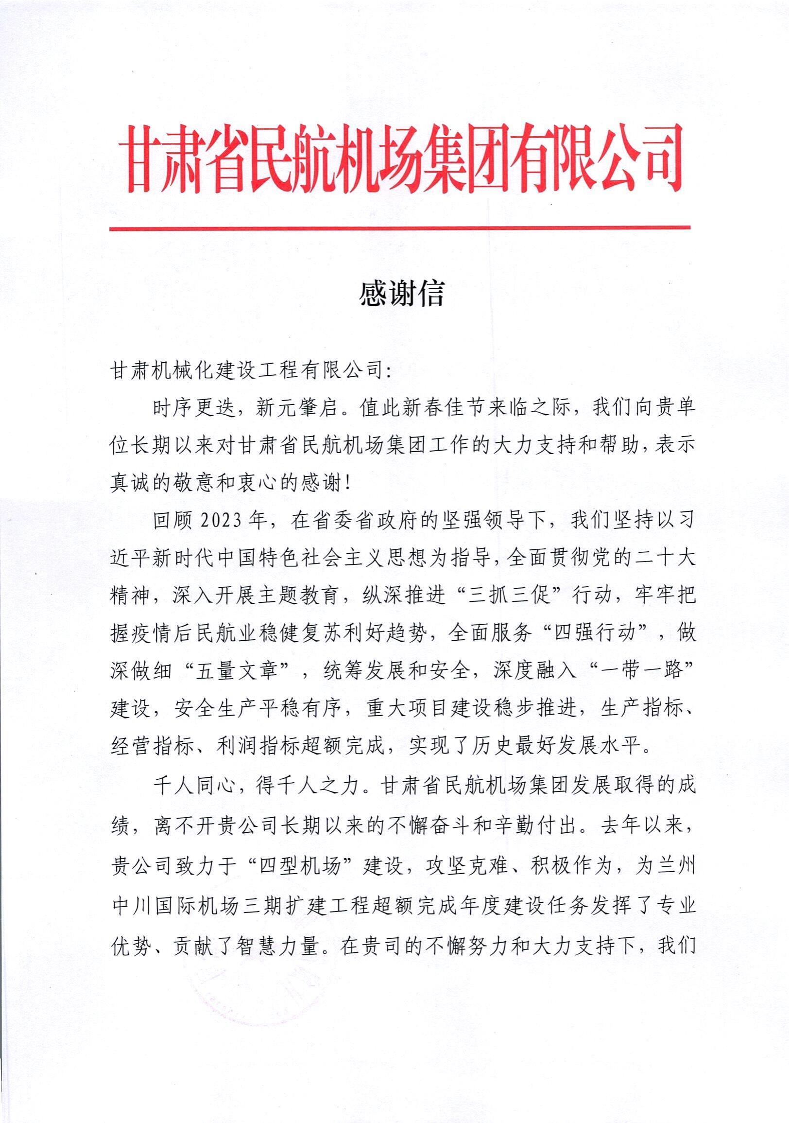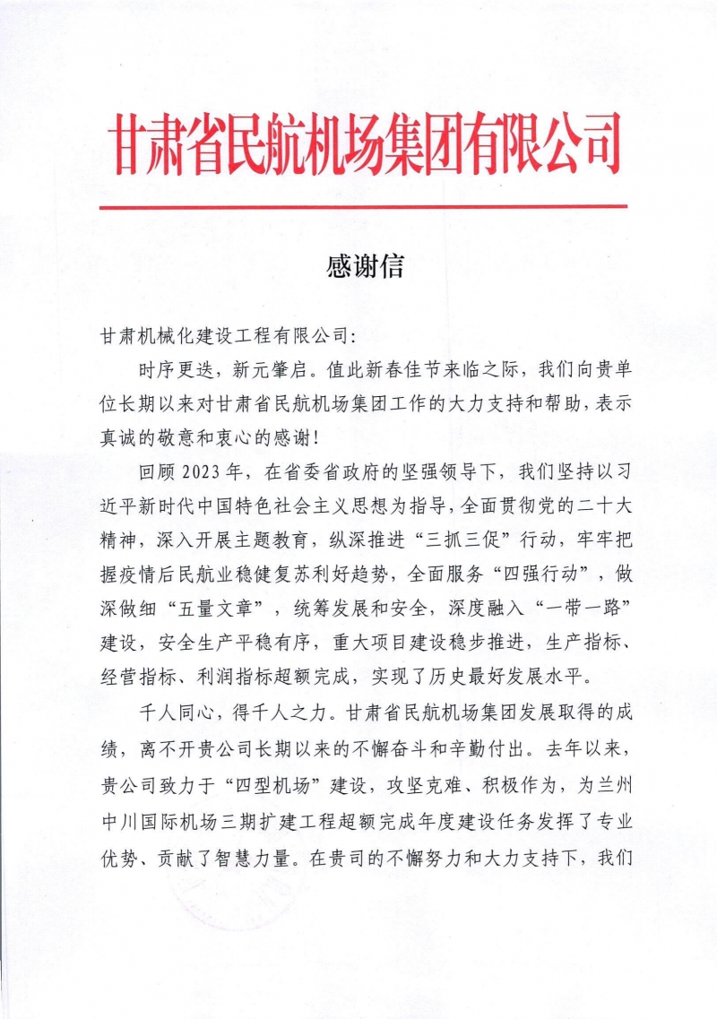 2月8日,新春佳節(jié)來(lái)臨之際,我司收到來(lái)自甘肅省民航機(jī)場(chǎng)集團(tuán)有限公司的感謝信。